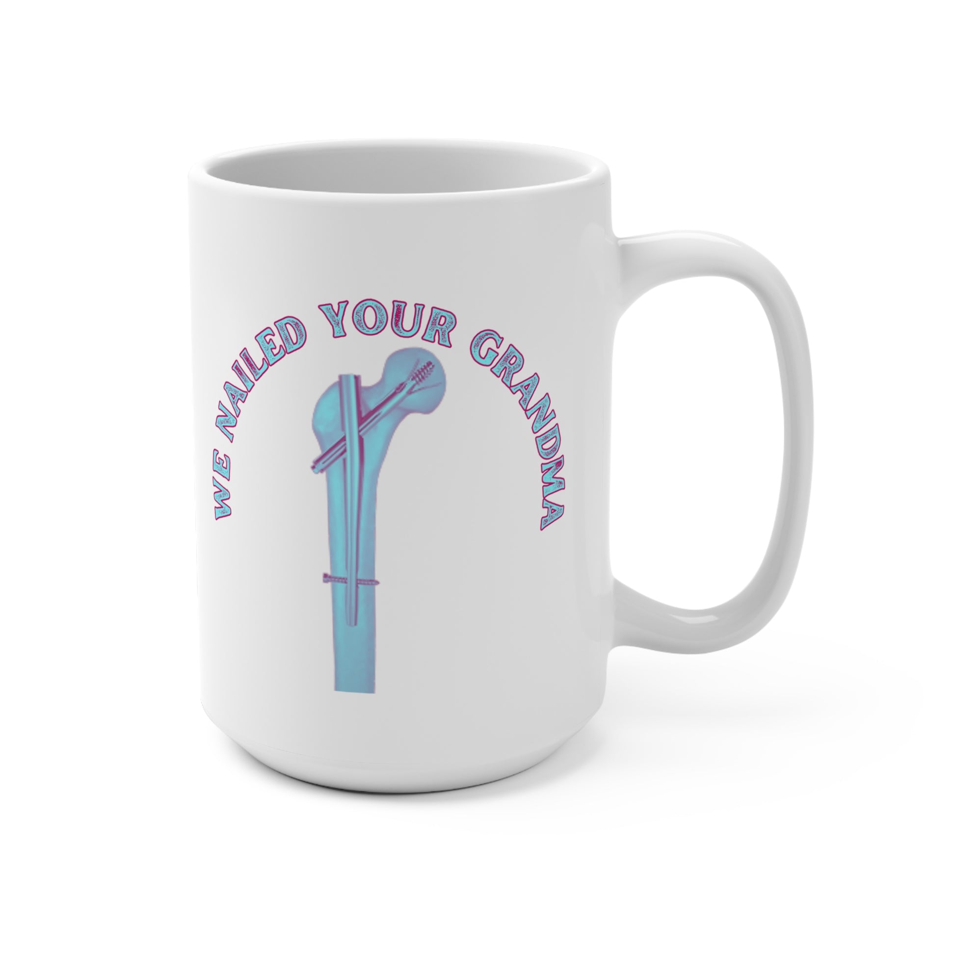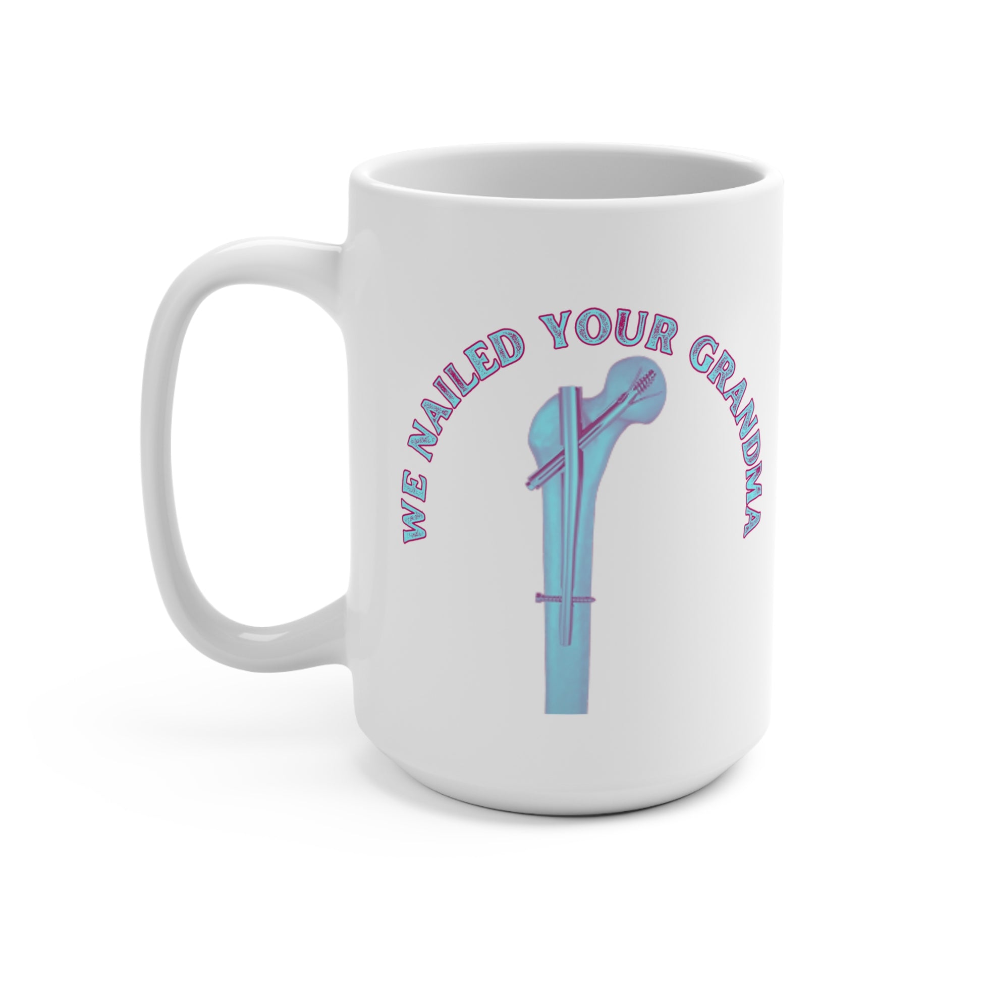 Bones and Brews, The We Nailed Your Grandma 15 oz Mug - Celebrating Orthopedic Triumphs with a Twist of Humor! CRNA, Ortho, Surgery