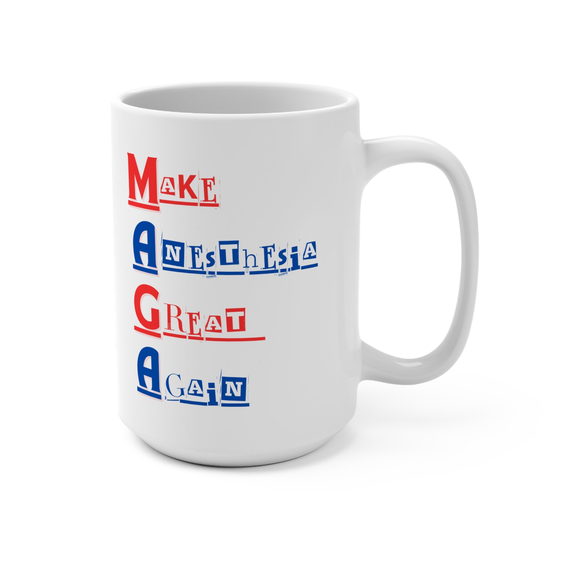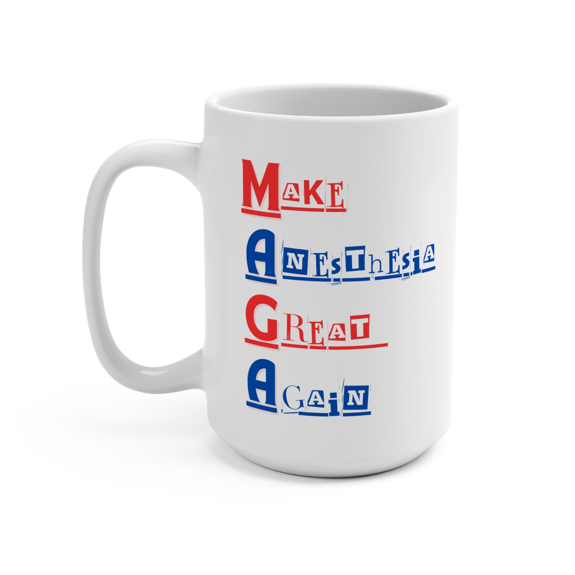 Picture this: Your favorite brew or beverage of choice nestled in the crisp white embrace of this mug, with "MAGA" subtly hinting at a world where the only debates involve gas vs. intravenous induction. It's a mug that says, "Let's bring back the joy, the camaraderie, and the laughter to the world of anesthesia!"